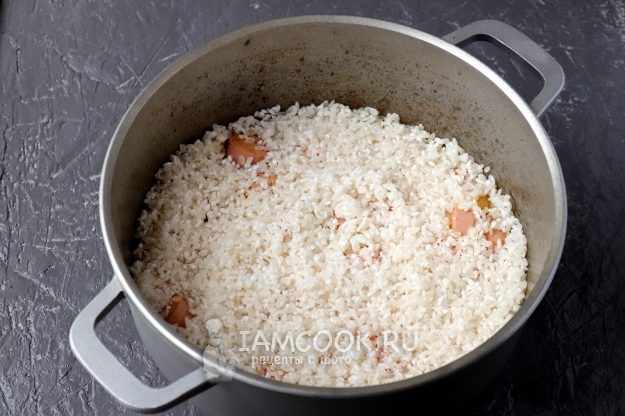 Тем временем тщательно промываем рис, меняя воду 3-4 раза. Отправляем его в казан и распределяем ровным слоем поверх остальных ингредиентов, ничего не перемешивая.