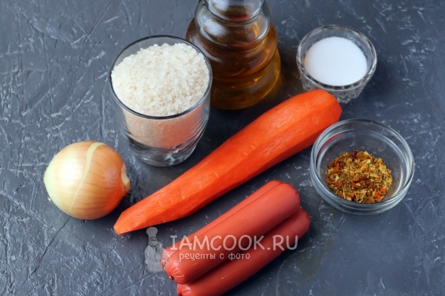 Для приготовления плова с сосисками подготовим продукты по списку к рецепту.