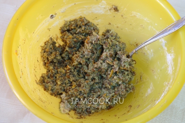 Соединяем в одной миске гречку, тушеные овощи и чечевицу. Вбиваем яйцо, добавляем сметану, всыпаем специи по вкусу: тимьян, укроп, соль и перец.