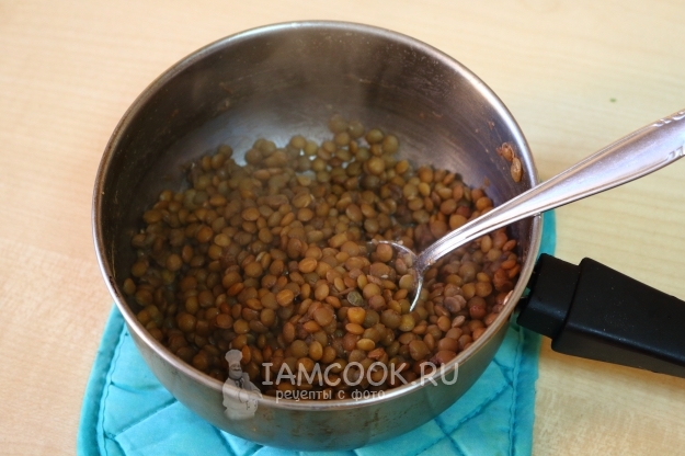 Чечевицу также промываем, заливаем 1,5 л воды, подсаливаем и варим 15-20 минут. Вода должна впитаться, а чечевица - стать мягкой.