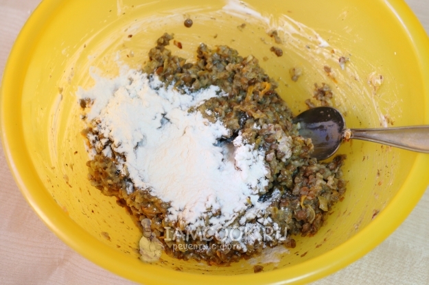 Перемешиваем и добавляем муку. Она сделает тесто более податливым для лепки.
