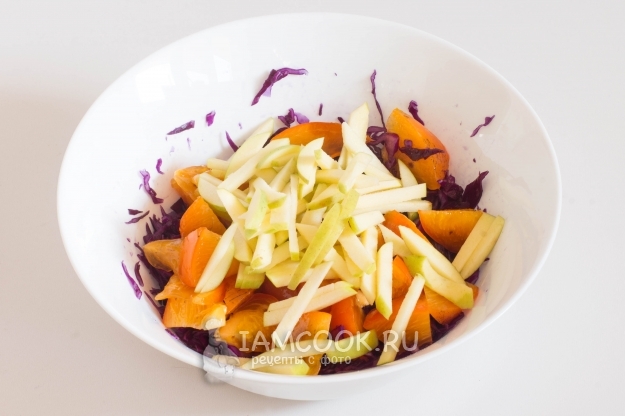 Хурму промойте, удалите плодоножку. Мякоть нарежьте не большими, но и не сильно мелкими ломтиками, так, чтобы удобно было кушать, и добавьте в миску к капусте.