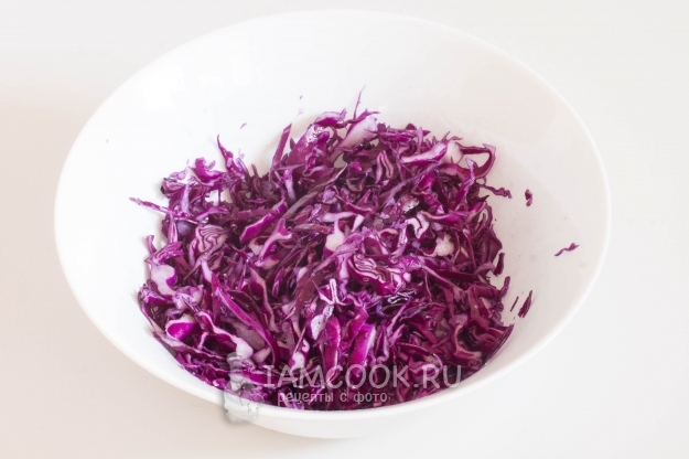 Краснокочанную капусту мелко нашинкуйте, поместите в миску, посолите и помните руками, чтобы капуста стала мягкой. Как известно, такая капуста достаточно жестковата и суховата, если ее не перетирать с солью.