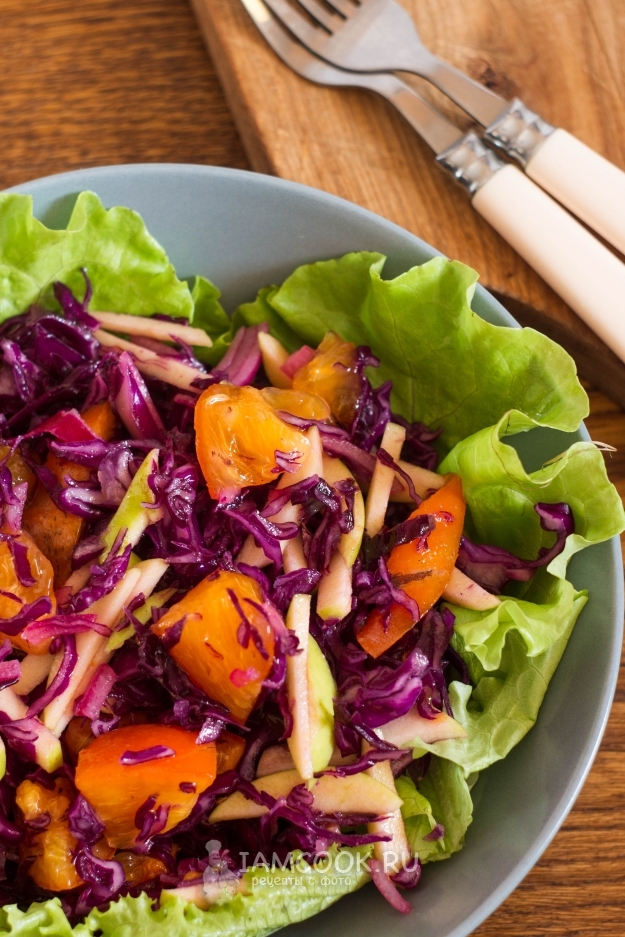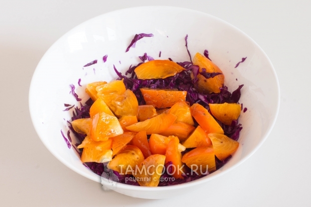 К столу салат из краснокочанной капусты с хурмой желательно подавать сразу же (можно на «подушке» из листьев салата или же без таковых), но некоторое время он также спокойно может постоять и в холодильнике.