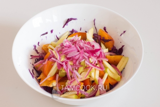 Красный лук нарежьте четверть-кольцами, обдайте кипятком и замочите на 10 минут в яблочном уксусе. Затем уксус слейте, а лук добавьте в салат.