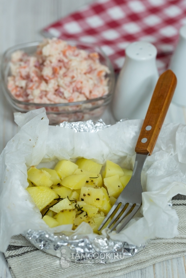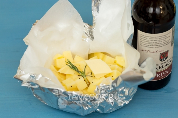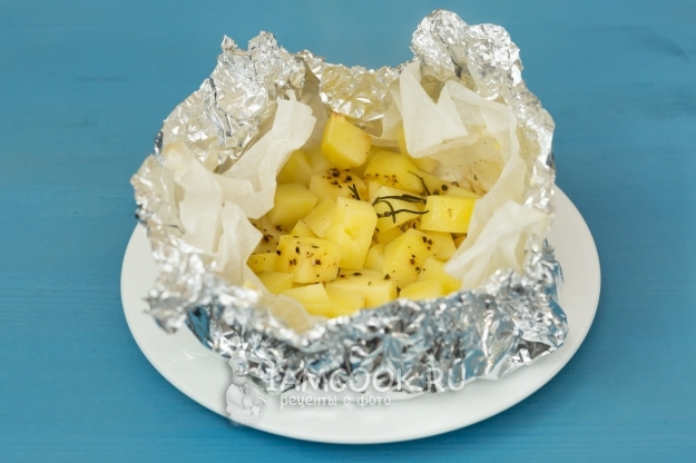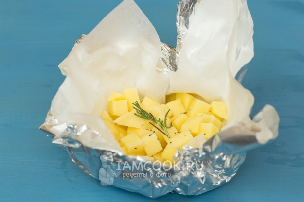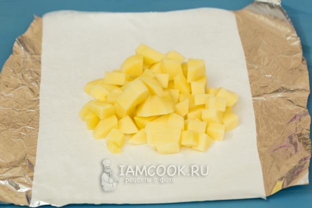 Оторвать лист фольги, на него положить лист пергамента. На пергамент - нарезанный крупными кубиками картофель.