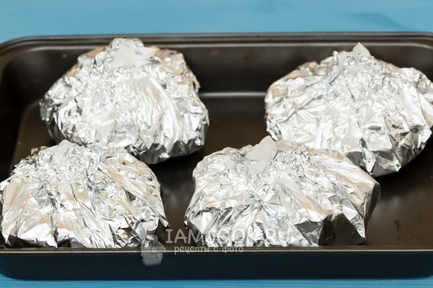 Запекать в разогретой до 200 градусов духовке до готовности картофеля. Это займет приблизительно 30 минут. Все будет зависеть от сорта картофеля.