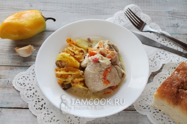 Подавайте фрикасе из курицы с болгарским перцем с любым гарниром. У меня - запеченный с сыром картофель.