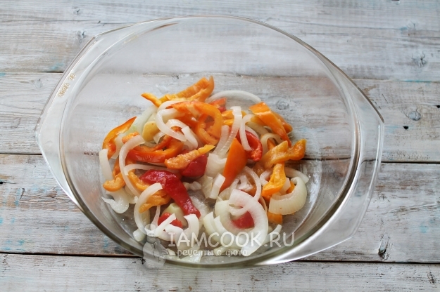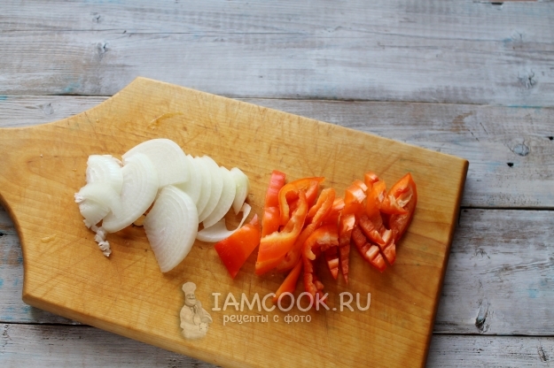 Полукольцами нарежьте репчатый лук, среднего размера дольками - сладкий перец.