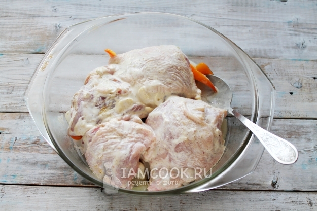 Смажьте курицу сметаной и оставьте в этом ароматном маринаде на полчаса, затянув пленкой. Держите курицу в маринаде в холодильнике.