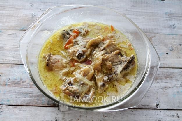 Добавьте в кастрюлю подготовленную курицу вместе со сметанным маринадом.