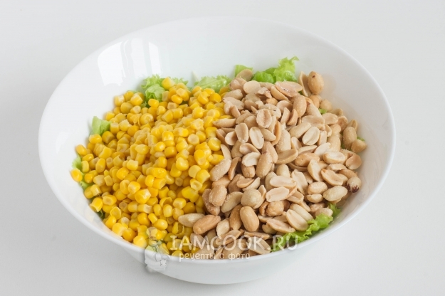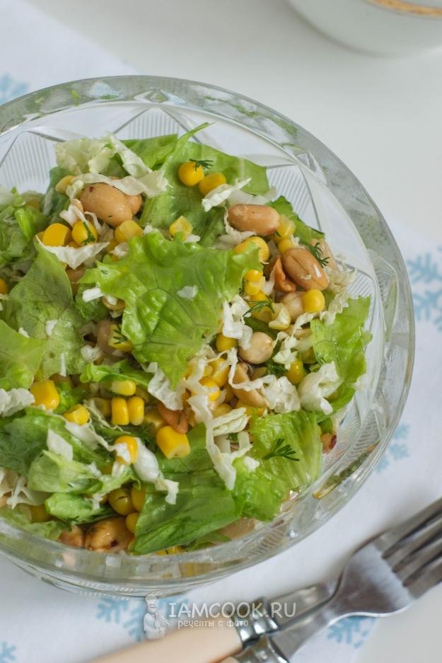 Подавать салат с кукурузой и солёным арахисом можно сразу же после приготовления!