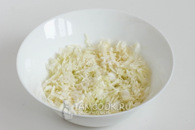 Пекинскую капусту мелко нашинкуйте и поместите в просторную миску.