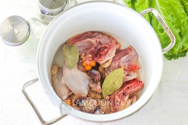 Тщательно промойте тушки птиц, извлеките из них внутренности, располовиньте и каждую половину еще раз разрежьте пополам. Таким образом из одной тушки получится 4 крупных части. Промойте их еще раз и выложите вместе с внутренностями в кастрюлю. Добавьте лавровые листья.