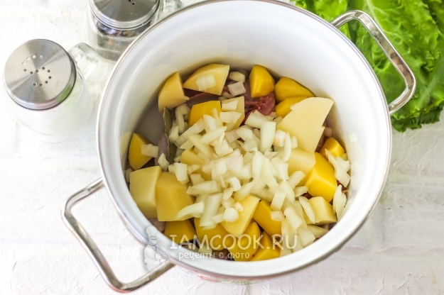 Очистите картофель и лук от кожуры, промойте в воде и нарежьте картофель средними кубиками, а луковицу - мелкими. Добавьте в кастрюлю или казан, сотейник.