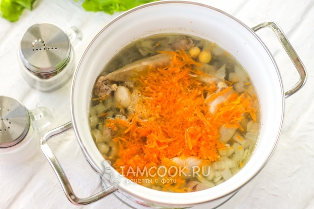 Морковь очистите, промойте и натрите на терке с мелкими ячейками. Добавьте в кастрюлю за 10 минут до окончания варки.