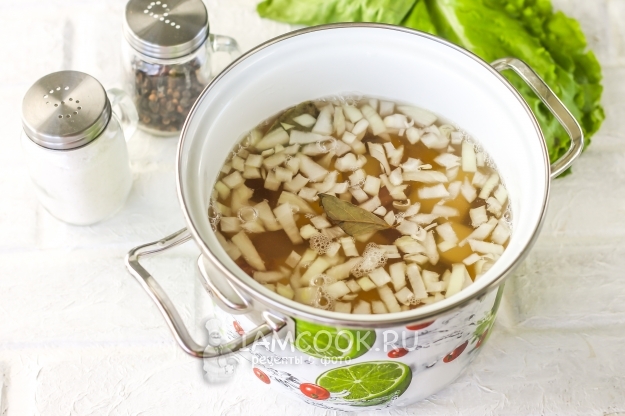 Залейте теплой водой и добавьте немного соли. Поместите кастрюлю на плиту и доведите содержимое до кипения, удалите образовавшуюся пену шумовкой. Варите в течение 15 минут на среднем нагреве.