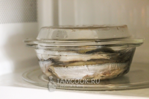 Емкость с отварной мойвой аккуратно извлеките из микроволновки и откройте крышку, стараясь не обжечься паром.