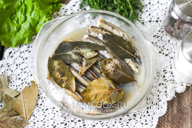 Всыпьте соль, молотый черный перец и выложите лавровые листья.