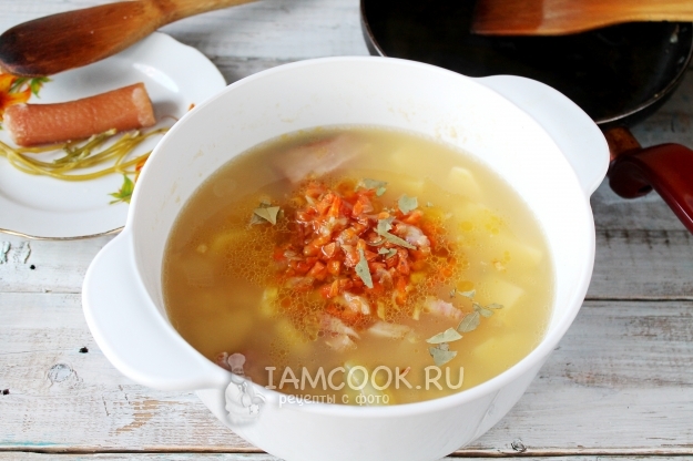 Приправьте разломанными листочками лаврушки. Доведите суп до кипения и выключите плиту, немного подержите под крышкой, чтобы гороховый суп слегка настоялся.