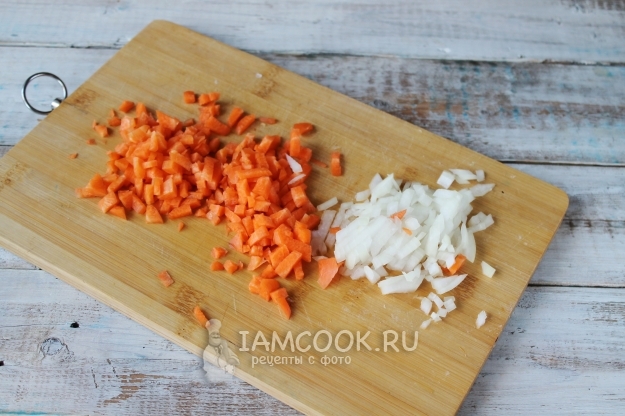 Для приготовления заправки очистите и мелко порежьте лук и морковь.