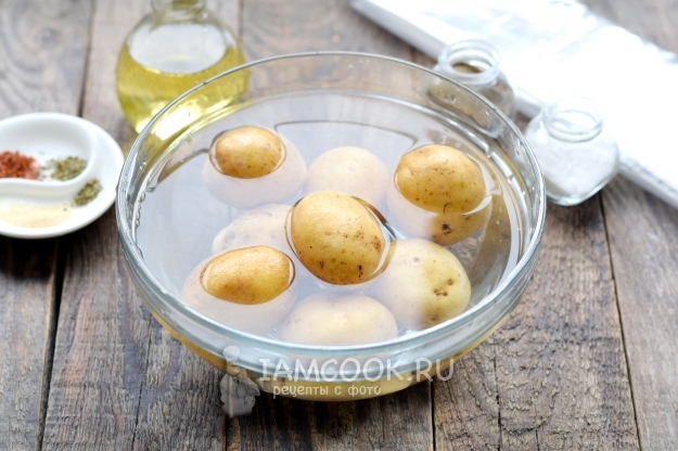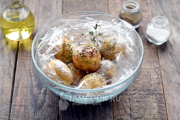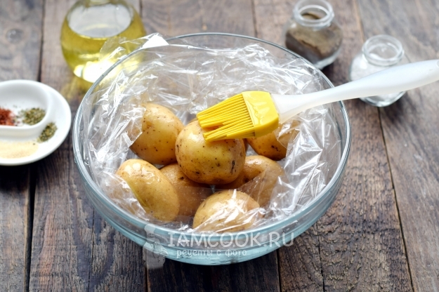 Подготовьте специальный пакет для запекания, внутрь уложите целые клубни картофеля, не счищая с них кожицу. После каждый клубень смажьте со всех сторон растительным маслом с помощью силиконовой кисти. Оставшееся масло вылейте сверху.