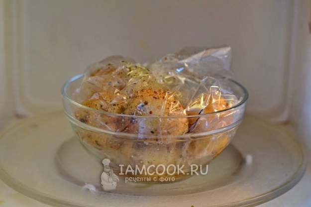 Целлофановый пакет плотно завяжите, хорошо потрясите, чтобы специи и масло внутри по максимуму обволокли клубни. Пакет с содержимым поместите в емкость, которая подходит для использования в микроволновой печи. Емкость загрузите внутрь, установите максимальную мощность. Готовьте картофель в микроволновке примерно 12 минут. Но время приготовления может варьироваться в зависимости от размера выбранных клубней и от мощности СВЧ-печи. Например, если максимальная мощность вашей микроволновки меньше 800 Вт, тогда время приготовления увеличится до 15 минут.