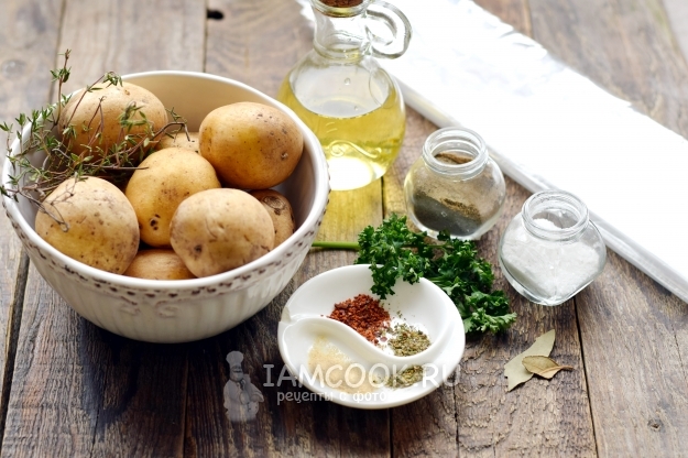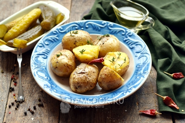 Готовый картофель можно полить еще порцией масла. Подавайте запеченный картофель совместно с соленьями или свежими овощами. Приятного аппетита!