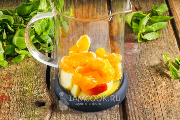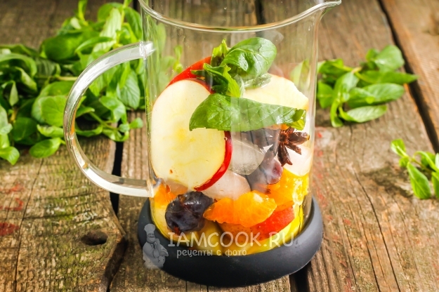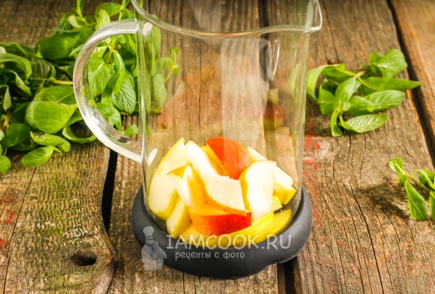 Промойте сливы и удалите из них косточки, промойте второе яблоко и нарежьте его кружочками. Добавьте все в емкость вместе с промытыми листьями мяты.
