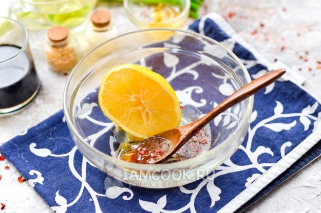 В мисочку выдавить сок лимона, добавить немного меда и всыпать специи. Соль можно не использовать в рецепте, соевый соус даст солоноватый привкус как раз в нужном количестве. Также добавить в миску ложку растительного масла.