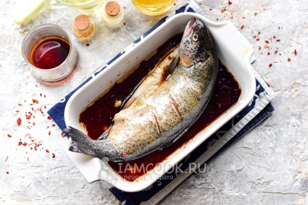 Форель переложить в форму, залить соусом. Переставить форму в холодильник на полчаса. Спустя время можно прогреть духовку до 180 градусов.