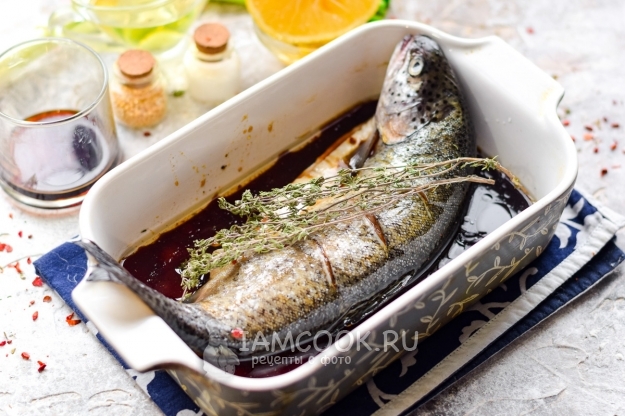 Добавить в форму веточки тимьяна и отправить форель запекаться – 25-30 минут. После подавать вкуснейшую форель, запеченную в соевом соусе, к столу.