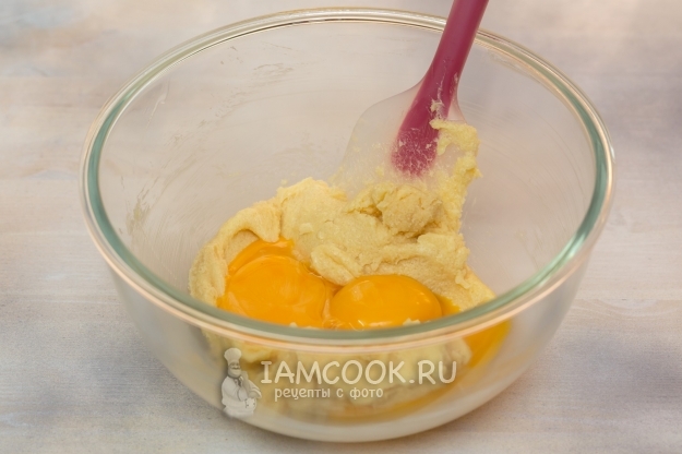 Добавить желтки. Белки отложить, они понадобятся для начинки.