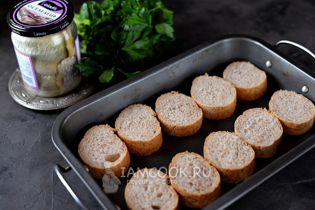 Бутербродную булку небольшого диаметра нарежьте толщиной около 1 сантиметра, выложите в небольшой противень, подсушите в горячей духовке до состояния гренок.