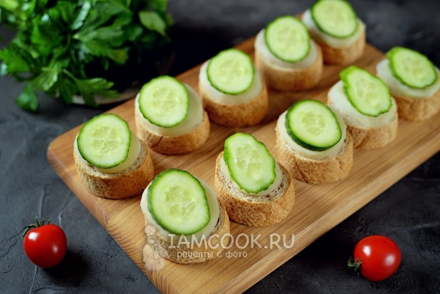Гренки остудите, выложите на каждую тонко нарезанные кружочками картофель и свежий огурец.