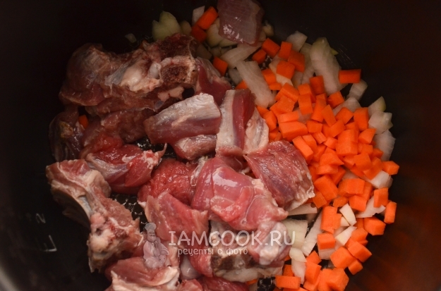 На дно чаши мультиварки налейте растительное масло без яркого запаха и вкуса. Туда же отправьте лук и морковь, а также кусочки баранины. По желанию можно обжарить овощи с мясом в течение 10 минут на режиме "Жарка".