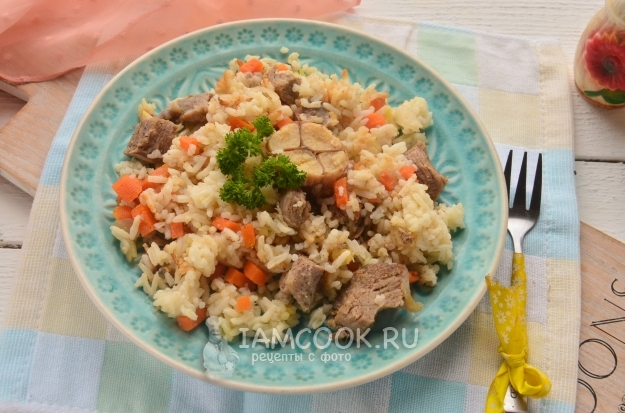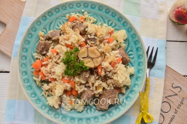Закройте крышку мультиварки и установите режим "Плов" на 1 час. После звукового сигнала мультиварки рассыпчатый плов с бараниной готов и его можно подавать.