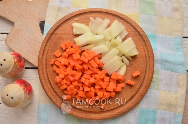 Репчатый лук нарежьте мелкими кубиками. Также мелко нарежьте и морковь, по желанию овощ можно натереть на крупной терке.