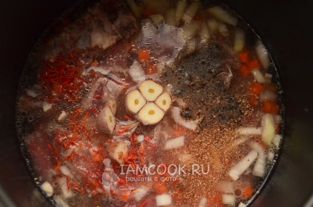 Влейте в чашу мультиварки воду (350 мл). Головку чеснока почистите и разрежьте пополам, отправьте в чашу. Также добавьте соль и специи для плова, шафран.