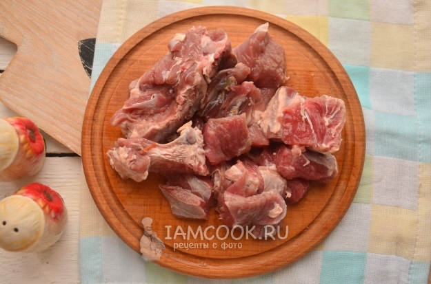 Баранину нарежьте более мелко, косточки оставляйте с небольшим количеством мяса. Все лишнее нужно обрезать (излишки жира, пленки).