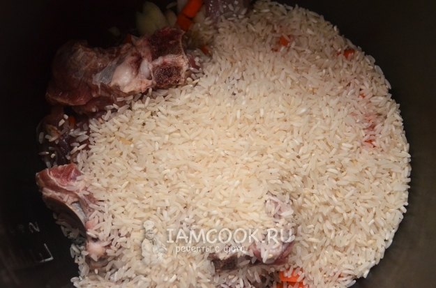 Пересыпьте в чашу мультиварки промытый длинный рис. Также можно взять среднезерный рис, но он может получиться более клейким. Также можно использовать специальный сорт риса для плова.