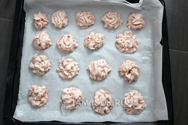 После взбивания должна получиться густая масса, которую в идеале при помощи кондитерского мешка с насадками нужно отсадить на силиконовый коврик, пекарскую бумагу и т.п.