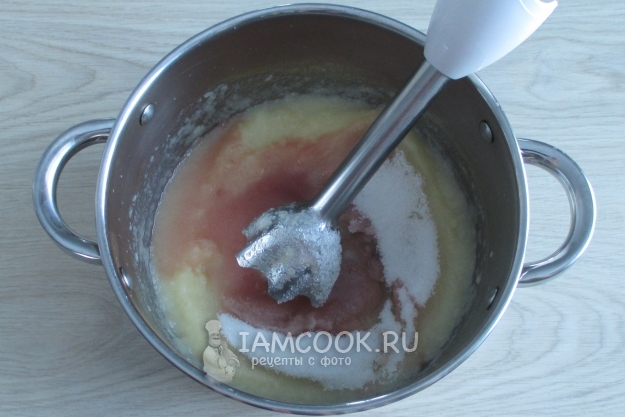 Добавьте в яблочное пюре порцию сахару и глинтвейна.