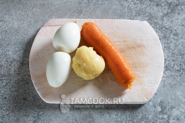 Морковь, картошку и яйца варим до готовности. Картошка и морковь должны стать мягкими, а яйца - твердыми. В смысле - вкрутую. Время варки яиц - 12 минут. Даем всему вареному остыть часок-другой.