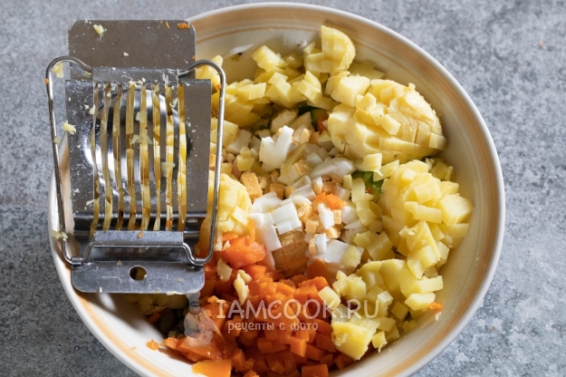 Яйца, морковь и картошку тоже режем на кубики. Кстати, разрешите порекламировать икеевскую металлическую струнную яйцерезку - отличная вещь, хочу вам сказать, причем режет не только яйца. Вот уже 16 лет как. Моя мама за столько же лет сменила уже не знаю сколько пластиковых яйцерезок. Хотя режет ими только яйца. Так что если вам вдруг где-нибудь когда-нибудь попадётся металлическая струнная яйцерезка - это не фигня-дорогая-непонятно-зачем-такая, а абсолютно незаменимый гаджет для приготовления оливье.