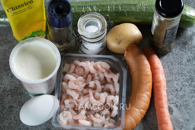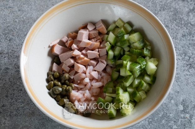 Креветки и каперсы не режем. У каперсов сливаем воду. Креветки, если не вареные, варим. Сардельку чистим. Её и огурец режем на кубики.