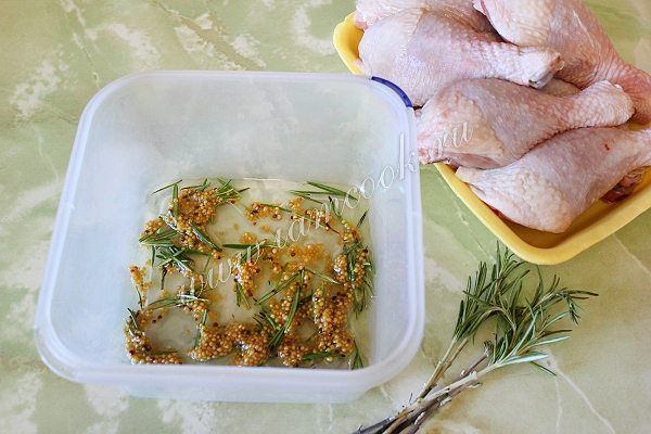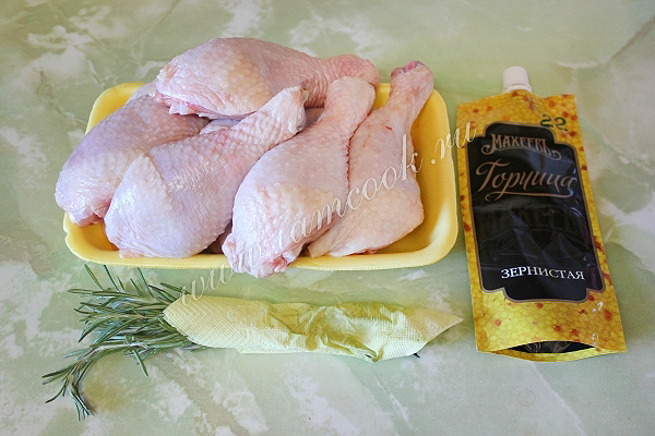 Куриное мясо с розмарином - очень хорошее вкусовое сочетание. Дополнительно можно добавить к розмарину то, что с ним гармонично сочетается: чеснок, лимон или зернистую горчицу. В этом рецепте показан вариант с куриными голенями, но можете использовать и другие части курицы. Так же на противень можно подложить и картофель, чтобы сразу получить к основному блюду и гарнир.