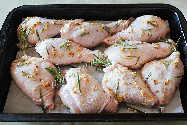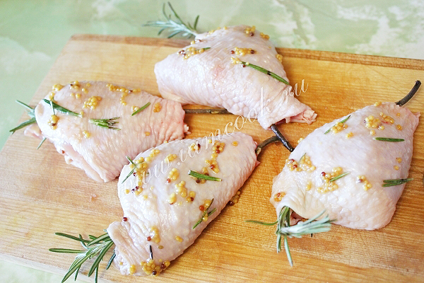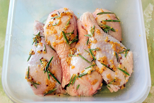 Подготовьте куриное мясо, розмарин, зернистую горчицу, растительное (например, оливковое) масло и соль.