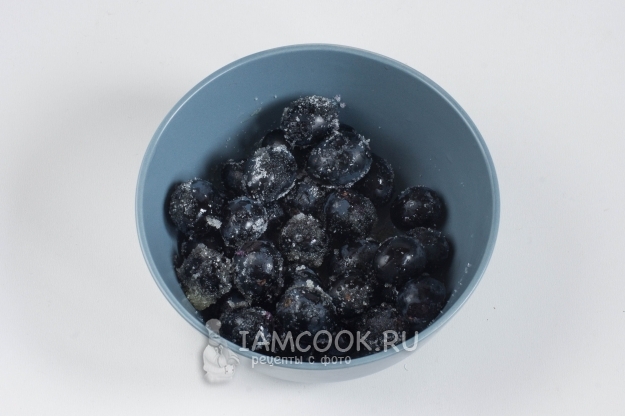 Виноград промойте, отделите ягоды от веточки, удалите подпорченные. Соедините с остатками сахара и оливкового масла. Перемешайте.