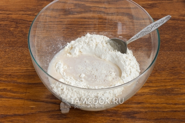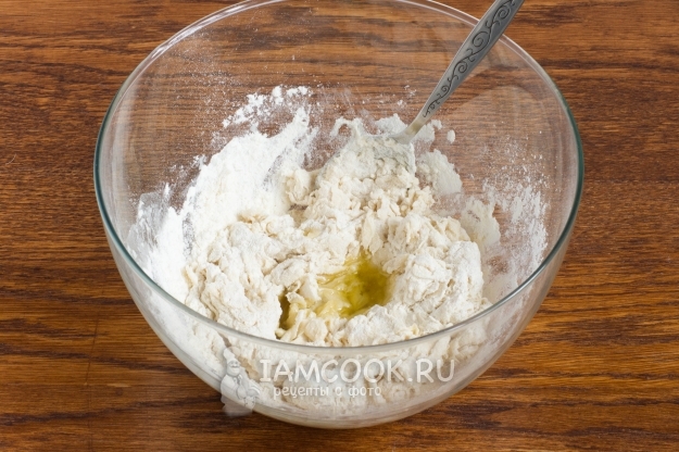 Начните замешивать тесто. В процессе влейте 2 ст.л. оливкового масла.